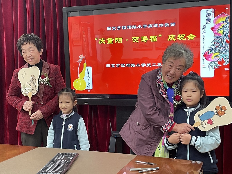 來(lái)自(zì)琳琅雅趣書(shū)畫(huà)社團一1中隊的楊雅涵、許娬妍同學,親手繪制了琅小園景于美麗的扇面上,贈送給兩位壽星。她們用稚氣的言語和老教師們訴說(shuō)着美好的祝願,祝願壽星們福祿雙全,開心快(kuài)樂!